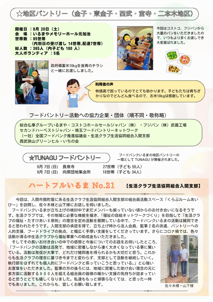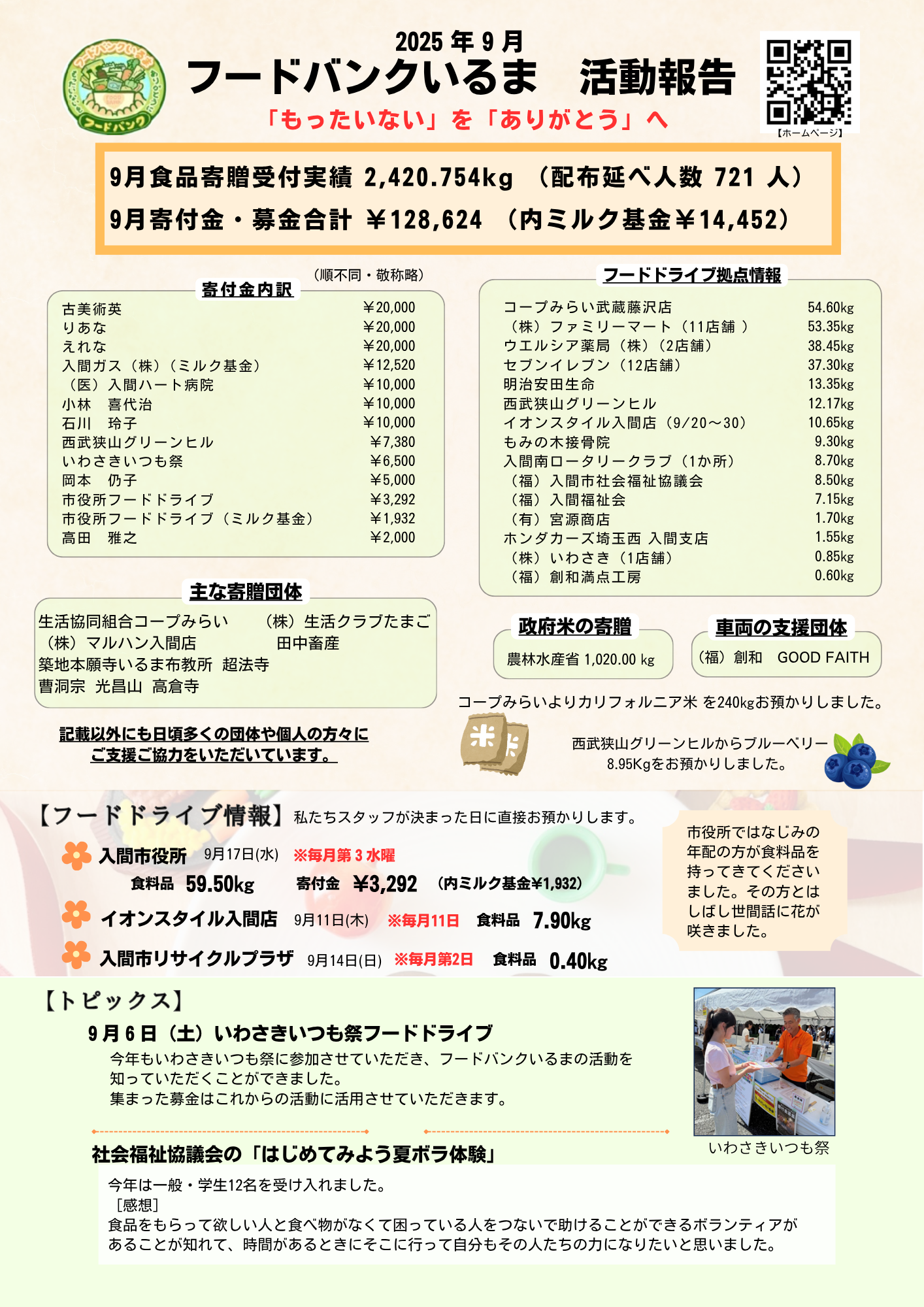 9月の活動報告です。 2025 10/12 お知らせ 2025年10月12日 お知らせ よかったらシェアしてね! URLをコピーしました! URLをコピーしました! 9月20日 いるまフードパントリー(金子、東金子、西武、宮寺・二本木)を開催しました。